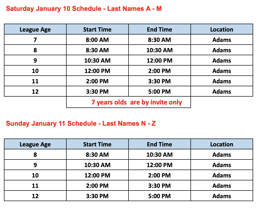 Player evaluations are critical for establishing draft pools allowing our professional coaching staff to select balanced teams. The results of the evaluation are one data point use to determine what division is best for each child. Your child will be placed in division based on several criteria such as: league age, skill level, prior coaching evaluations and results of the spring evaluations. All players will make a team thus this is not a “tryout” as it’s commonly called.